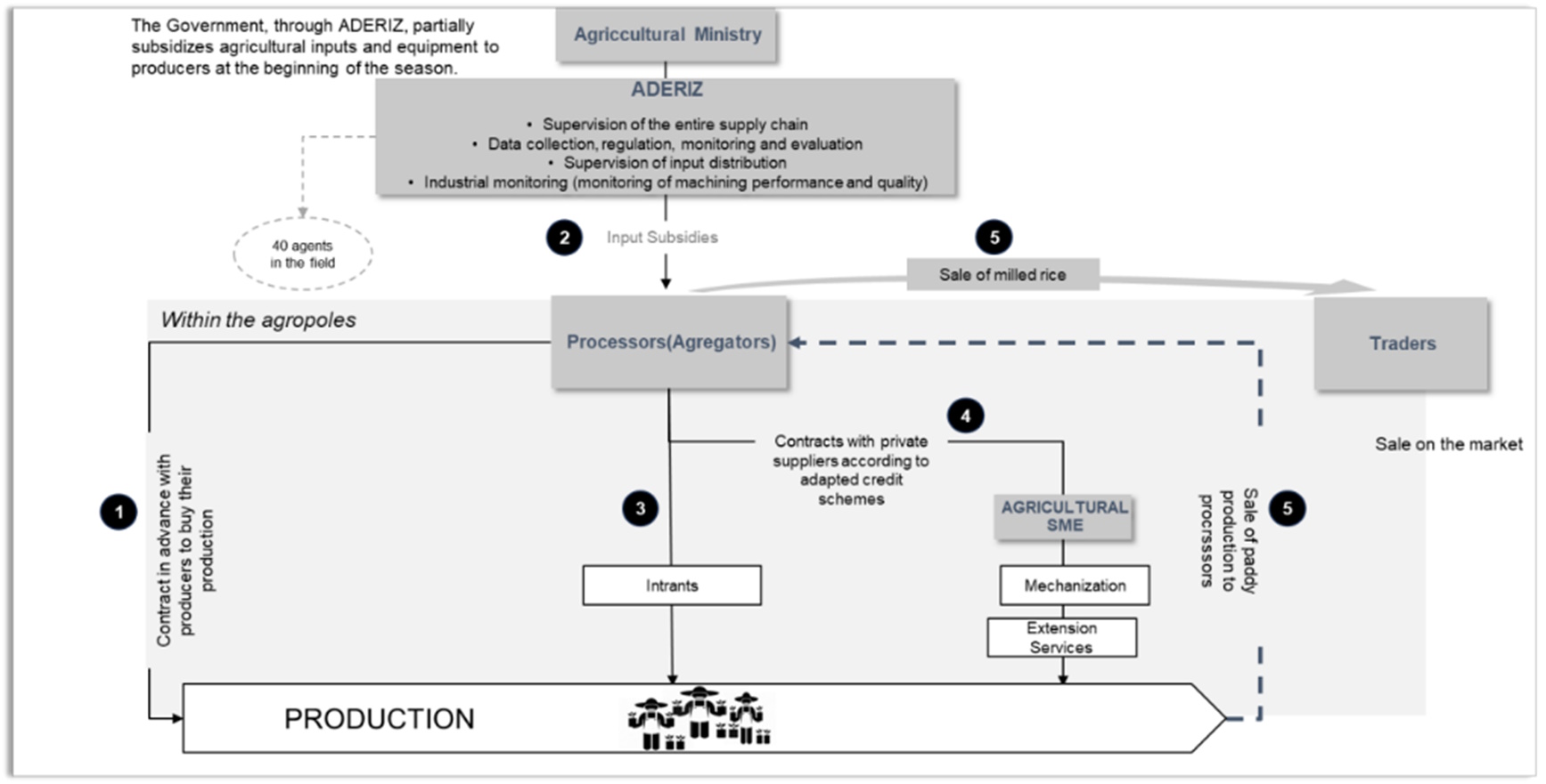 This system, coordinated and supervised by ADERIZ, facilitates the structuring of raw materials, financial, and informational flows, ensures secure relationships among stakeholders, and promotes the sustainability of financing cycles within the rice sector.