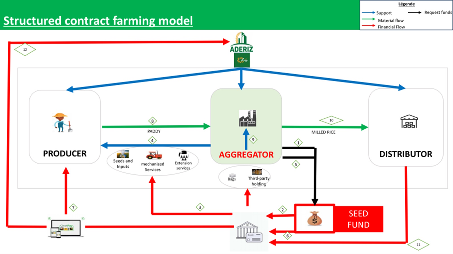 The rice aggregation model is currently being rolled out on a pilot basis, with financial support from the World Bank. The objective of the pilot is to be part of a gradual process of structuring supply chains, in particular through the establishment of a seed fund to test and adjust the model. The model chosen in the project is schematized below according to the different flows.